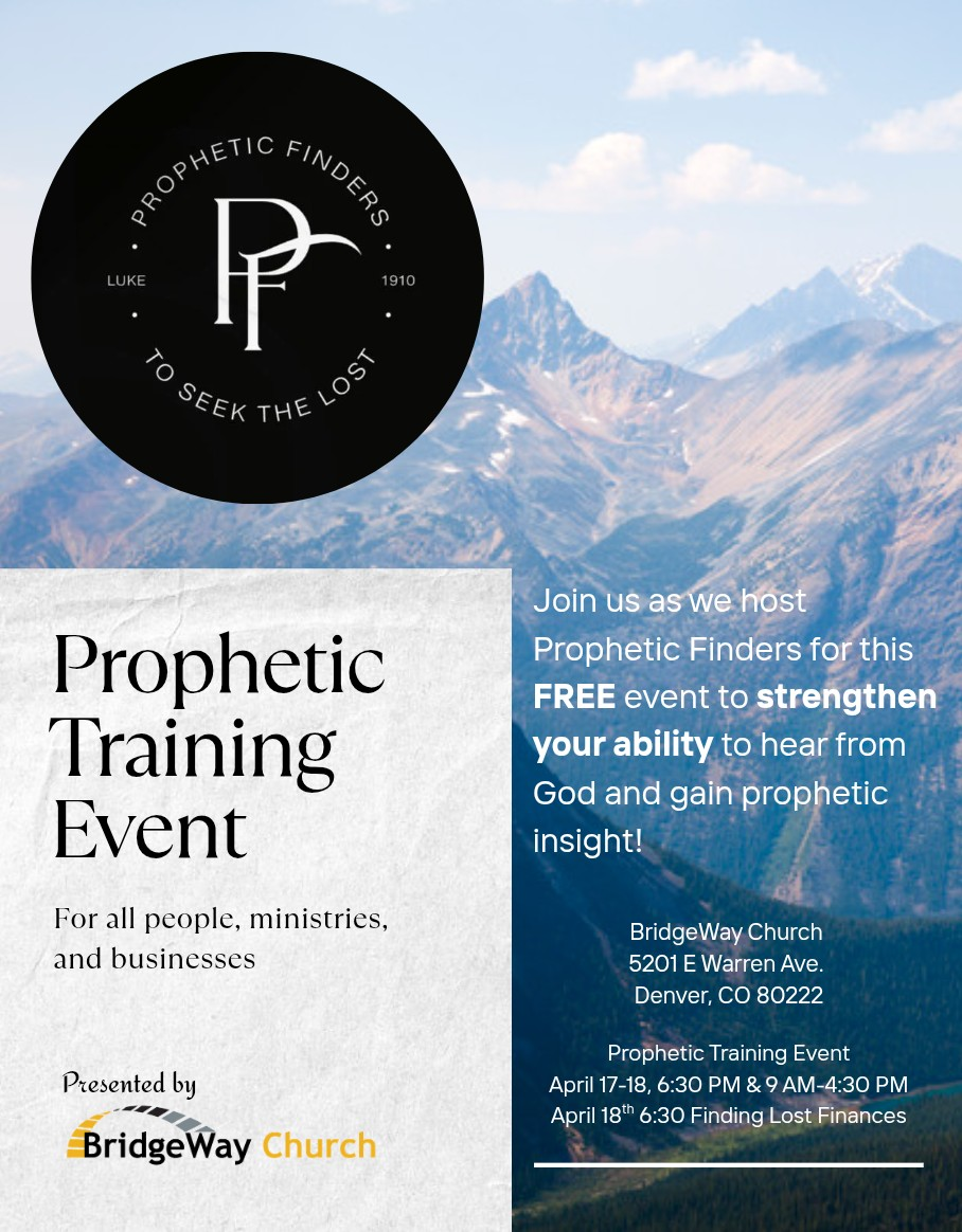 Join us as we host Prophetic Finders for this FREE event to strengthen your ability to hear from God and gain prophetic insight! BridgeWay Church 5201 E Warren Ave. Denver, CO 80222 April 17-18, 6:30 PM & 9 AM-4:30 PM April 18 6:30 Finding Lost Finances